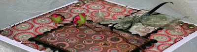Made a while ago for a challenge, using a variety of papers. I think they were a mix of Basic Grey and Funky Hand, and the border panel was created with a Cuttlebug Dotty Circles folder. The outside of the border was made with scalloped edge scissors, and the base layer of the focal panel was created with a Spellbinders nesting die. The edges of the papers were distressed and inked. Ribbons, brads and paper roses complete the design.